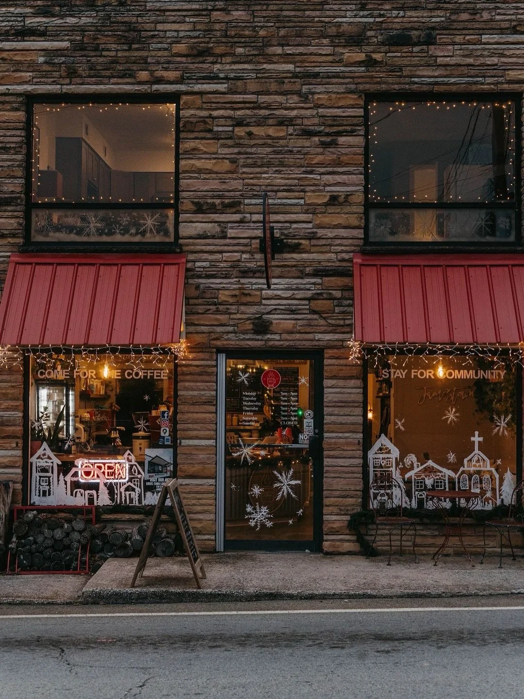 If you are coming off of HWY 127 onto HWY 52 W. Pass Walmart, Walgreens, the Jamestown water tower and First Baptist Church and come down the hill. You can park in the shared gravel parking lot with the CBD shop Boutique or continue through the traffic light and park across the street in the Chamber of Commerce Public parking.