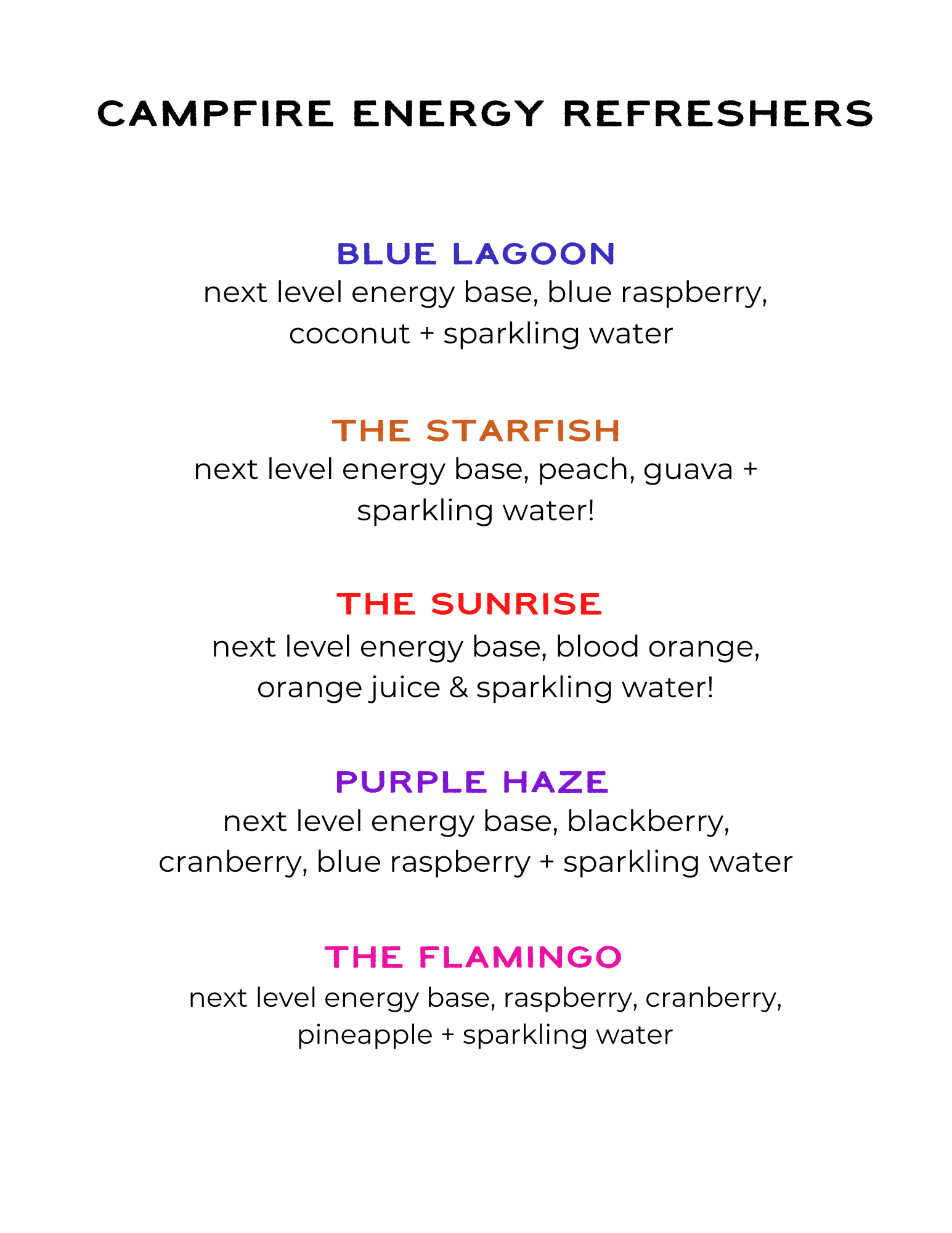 Energy Drinks made in-house with Next Level Energy Base, which derives from green coffee! Our focus here at Campfire Coffee is coffee, and we love that it is sourced from green coffee beans. The drinks are made with an energy syrup from Next Level Energy that is packed with natural caffeine, amino acids, and B vitamins. It is their version of a healthy, customizable energy boost!
